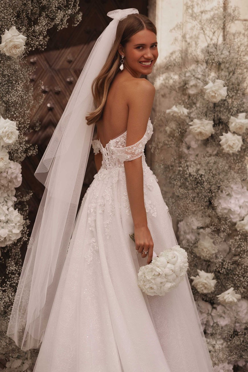 Rochie de mireasa cu bust plin din dantela si bretele cazute.