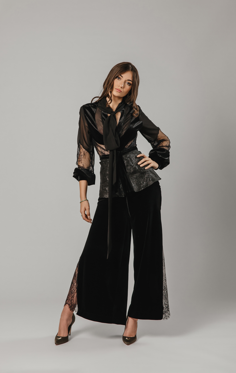 PANTALON MIDI DIN CATIFEA CU INSERTII DANTELA CHANTILLY LATERAL