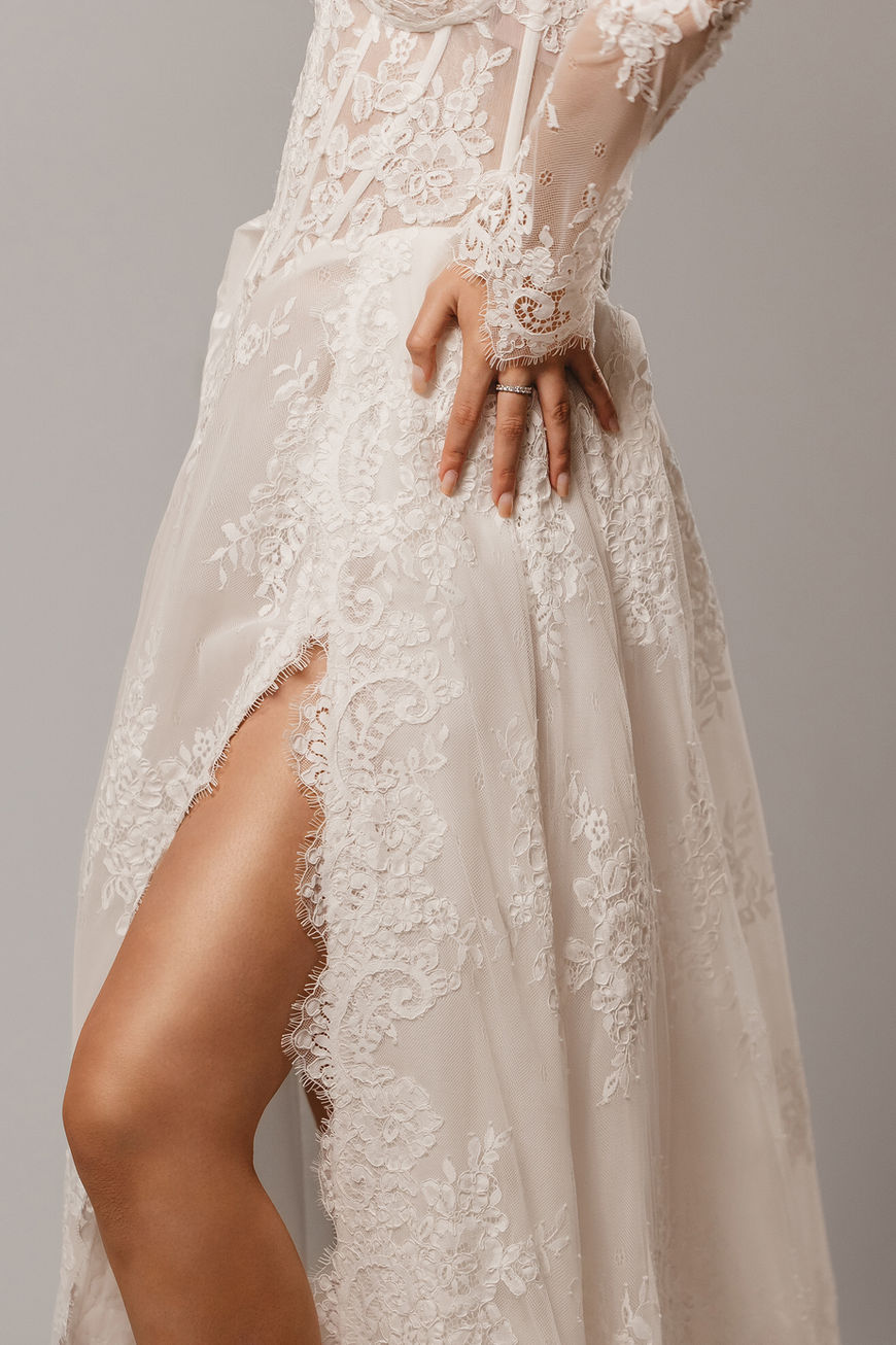 ROCHIE DE MIREASA CHANTILLY DREAM îmbină delicatețea dantelei Chantilly 3D cu un corset în V semi-transparent, care evidențiază silueta și cusături bine structurate.