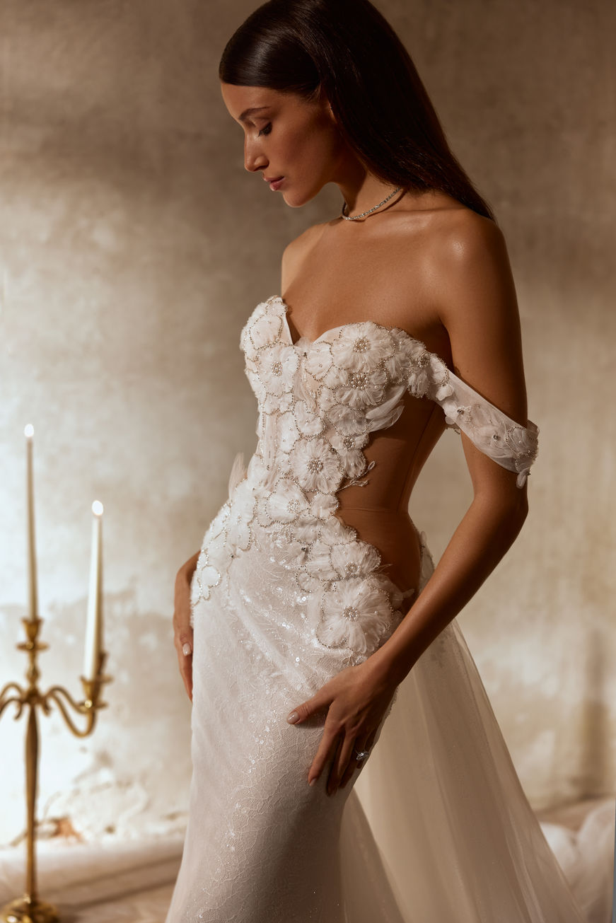 Corsetul este decorat cu flori tridimensionale delicate, fiecare accentuată cu perle mici și strălucitoare, oferind un aspect sofisticat și rafinat.