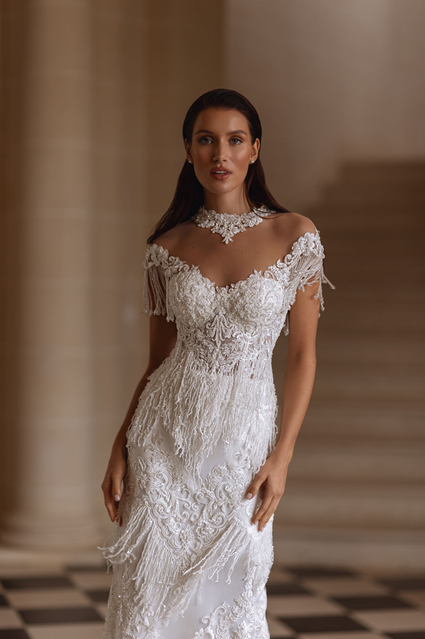 ROCHIE DE MIREASA CU FRANJURI STIL GATSBY si detaliu tip colier la gat.