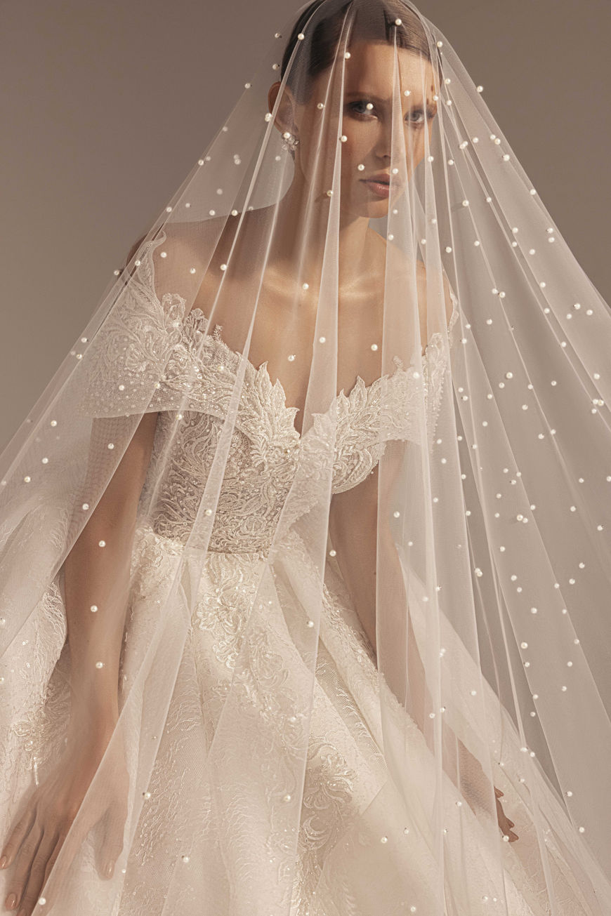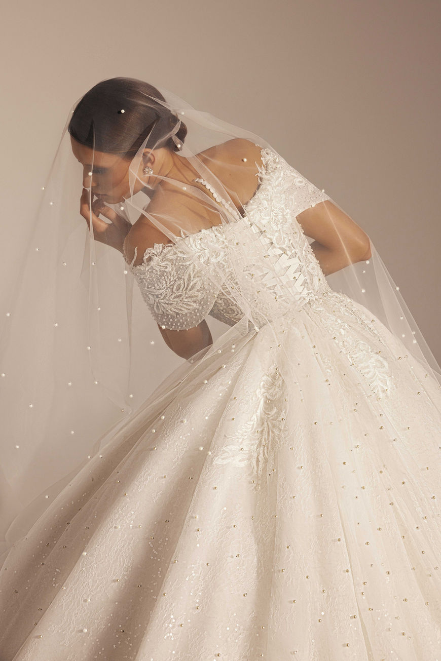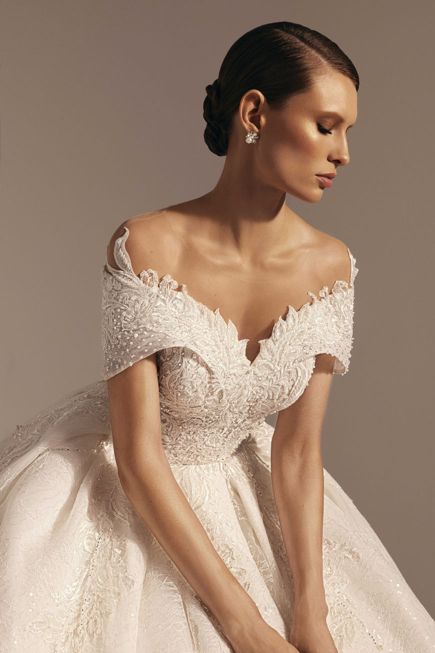 Corsetul este structurat cu decupaje în formă de frunze și detalii couture cusute manual, evidențiind linia decolteului în stil off-shoulder, care pune delicat în valoare umerii.