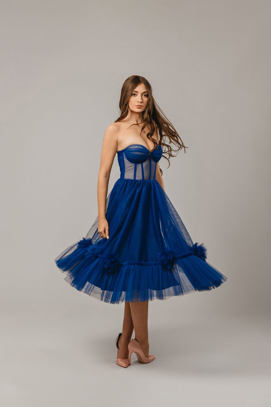 O rochie midi din tulle într-o nuanţă intensă de albastru regal, creată pentru a transforma orice apariţie într-un statement de eleganţă modernă.