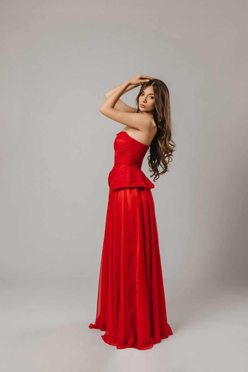 SET DE SEARA 2 PIESE CORSET SI FUSTA DIN VOAL DE MATASE ROSU SIZE S-M cucerește printr-un corset strapless, bogat drapat, cu decupaj adânc în V și linie basque, ce evidențiază talia și alungește silueta. Piesa superioară este croită din mătase ușor plisată.